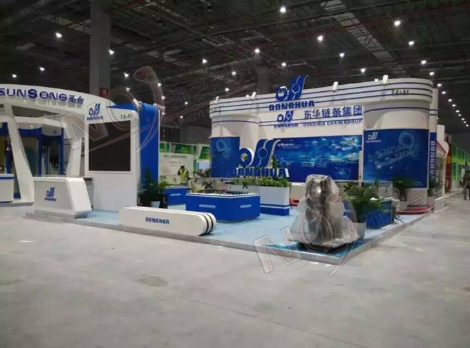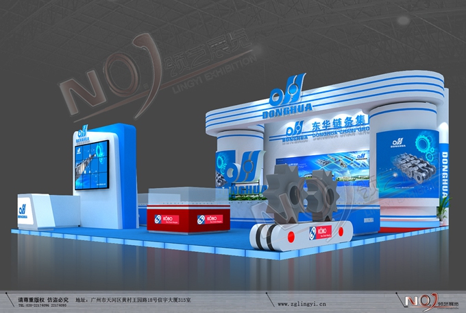 契合東華鏈條的品牌形象和產(chǎn)品特性,采用矩形結(jié)構(gòu),再搭配燈具燈光的效果,襯托出展位高端、時尚的氛圍,突出一種現(xiàn)代、大氣的時尚品味。