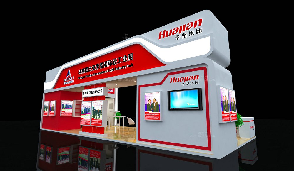 契合華堅(jiān)集團(tuán)的品牌形象和產(chǎn)品特性,采用矩形結(jié)構(gòu),再搭配燈具燈光的效果,襯托出展位大氣、豪華的氛圍,突出一種簡(jiǎn)約、時(shí)尚的品味。