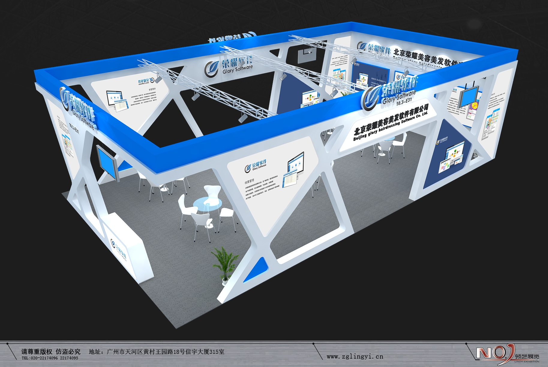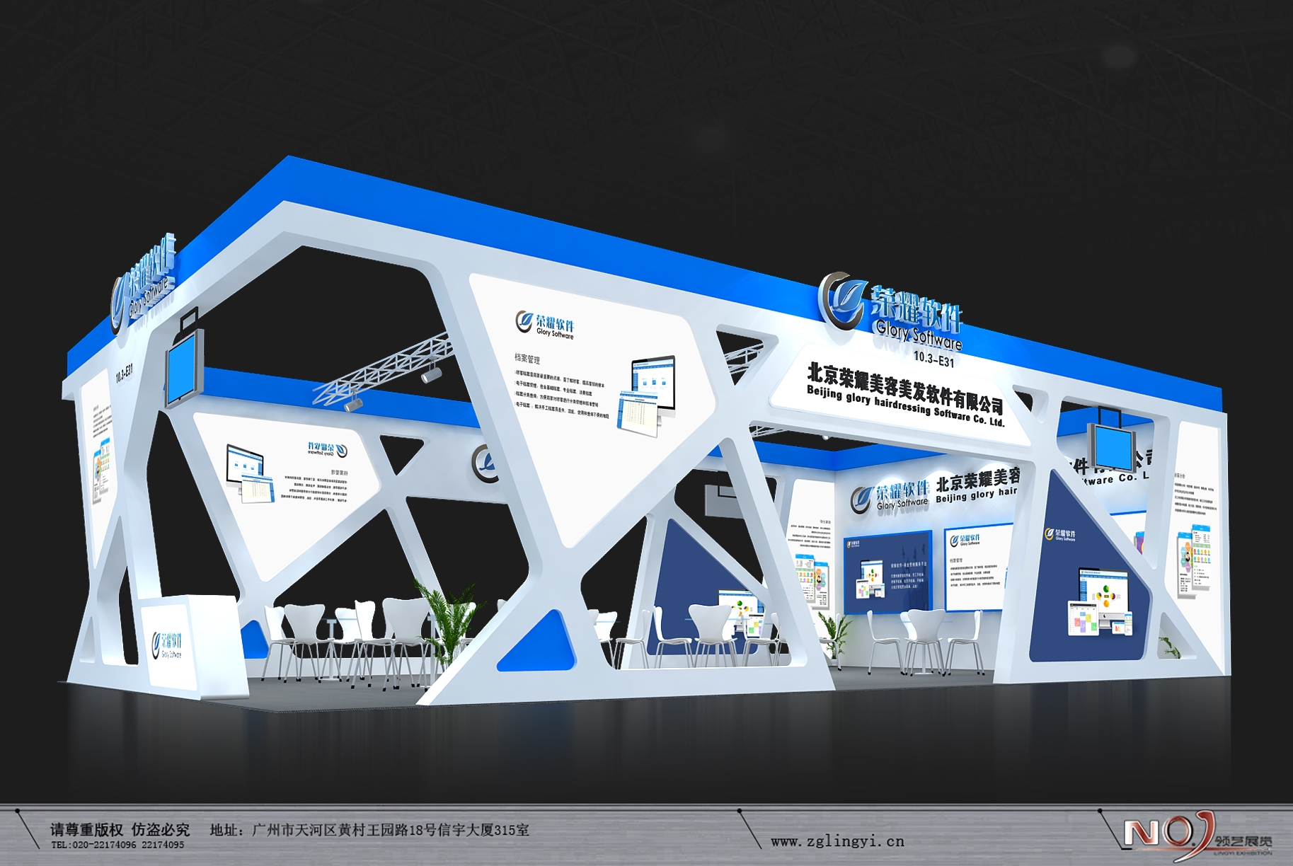 契合榮耀軟件的品牌形象和產(chǎn)品特性,采用線條,再搭配燈具燈光的效果,襯托出展位簡約、舒適的氛圍,突出一種現(xiàn)代、高端的時尚品味。