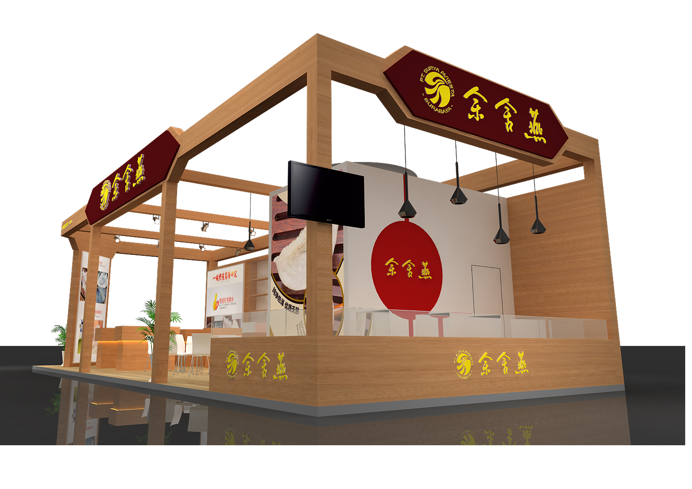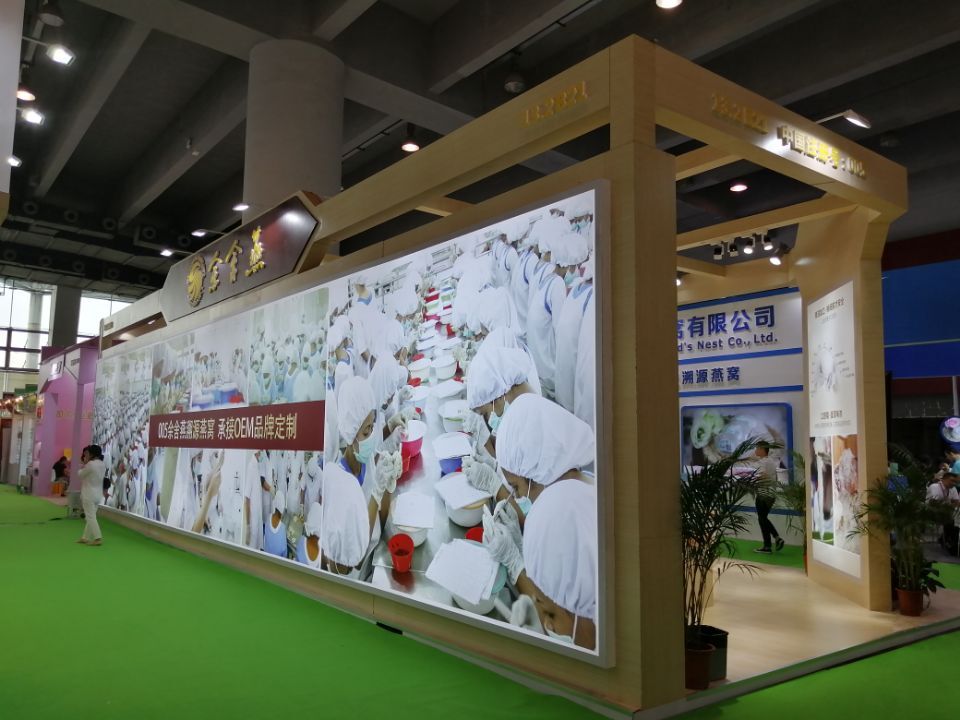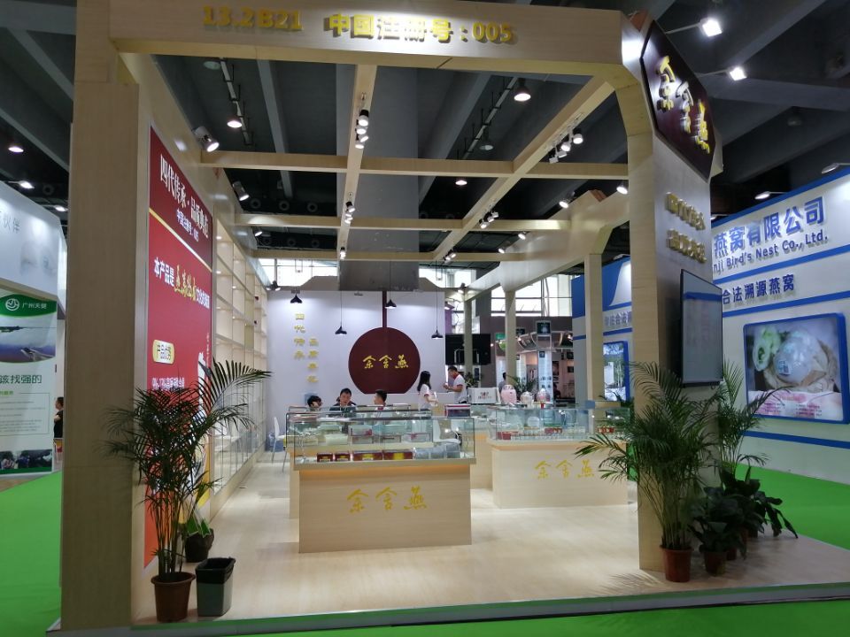契合余舍燕的品牌形象和產(chǎn)品特性,采用開放結(jié)構(gòu),再搭配燈具燈光的效果,襯托出展位大氣、豪華的氛圍,突出一種簡約、時(shí)尚的品味。