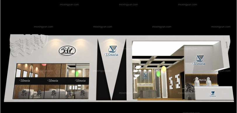 契合維涅斯的品牌形象和產(chǎn)品特性,采用曲線、框型結(jié)構(gòu),再搭配燈具燈光的效果,襯托出展位簡(jiǎn)約、融合的氛圍,突出一種高端、舒適的時(shí)尚品味。
