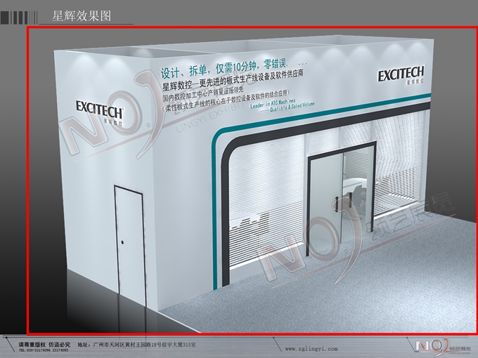 契合星輝數(shù)控的品牌形象和產(chǎn)品特性,采用框型結(jié)構(gòu),再搭配燈具燈光的效果,襯托出展位簡約、便捷的氛圍,突出一種精致、簡約的時尚品味。