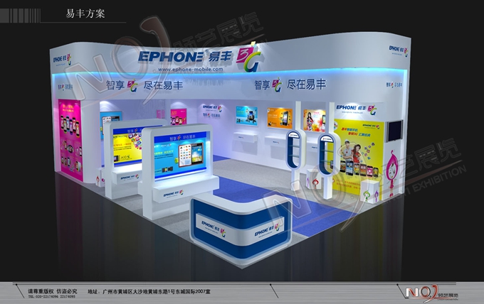契合易豐手機(jī)的品牌形象和產(chǎn)品特性,采用框型結(jié)構(gòu),再搭配燈具燈光的效果,襯托出展位簡約、便捷的氛圍,突出一種精致、簡約的時(shí)尚品味。