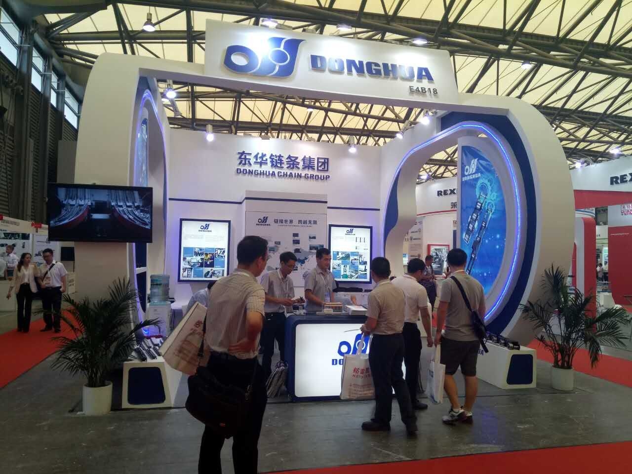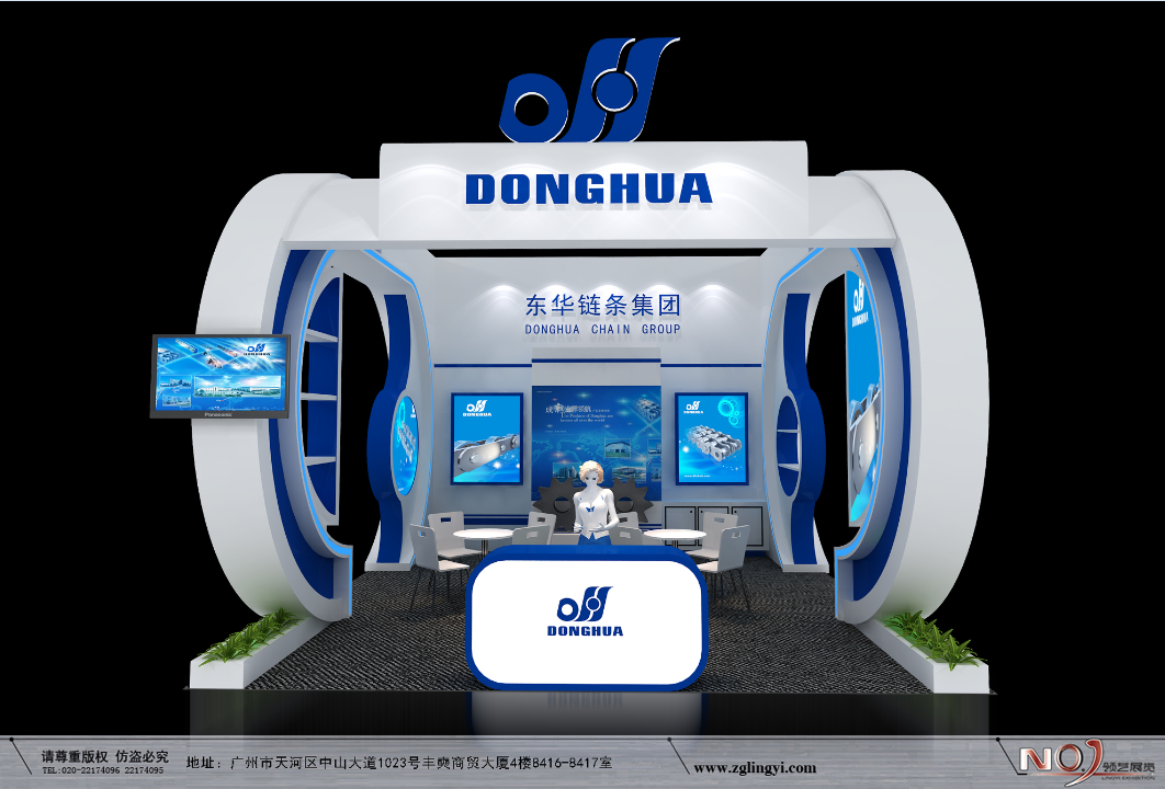 契合東華鏈條的品牌形象和產(chǎn)品特性,采用弧形、矩形結(jié)構(gòu),再搭配燈具燈光的效果,襯托出展位簡(jiǎn)約、時(shí)尚的氛圍,突出一種現(xiàn)代、簡(jiǎn)約的時(shí)尚品味。