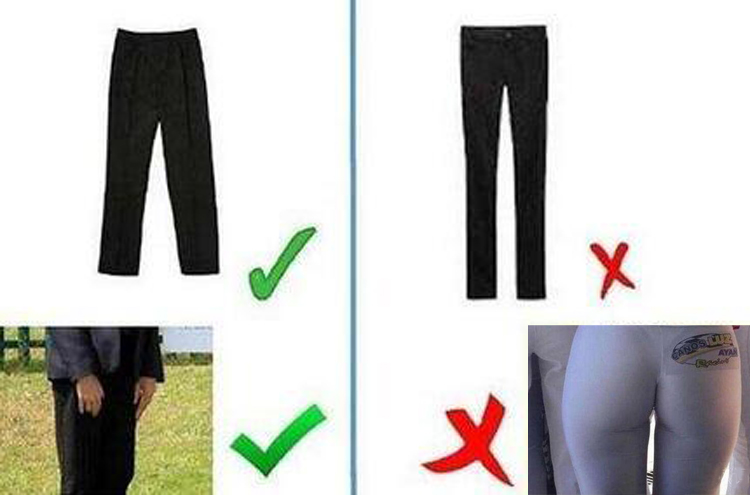 而在學(xué)校官網(wǎng)展示的合格校服圖解中,裙子是純黑色的,長(zhǎng)度適中,剛好到膝蓋上下一點(diǎn)。褲子也是黑色的,為寬松的直筒褲。而對(duì)于緊身褲和打底褲,圖解上打了一個(gè)大大的紅叉,被定義為不合格校服。