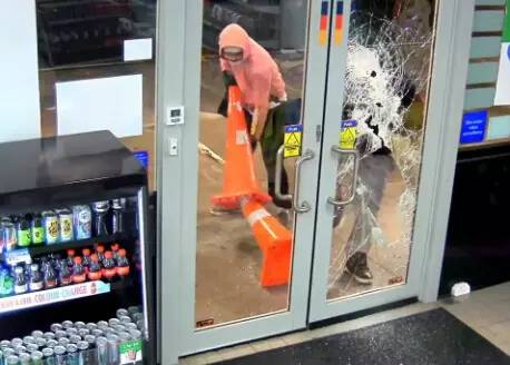 監(jiān)控錄像記錄了事發(fā)的整個過程:一開始,兩個帶著作案工具的蒙面盜賊在用力敲擊加油站內商店的玻璃門,動作十分兇狠。就在他們將要從被砸破的門洞中鉆進室內時,商店的一角開始噴發(fā)白色煙霧(仔細看下圖左上角)。