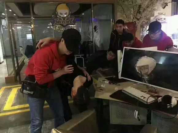 圖片很明顯看到,有一位小伙子的頭部穿過了屏幕,卡在顯示屏中部。而后網(wǎng)咖工作人員對其進行急救。
