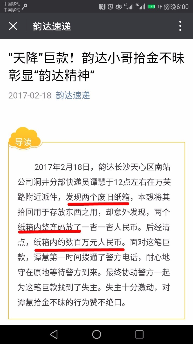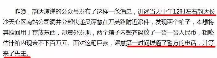 2月18日中午,長沙市洞井安置小區(qū)韻達快遞的員工譚慧在雨花區(qū)萬芙路長安郡小區(qū)二期門前馬路邊撿到一疊現(xiàn)金,給同在一個公司上班的堂哥譚某勝打電話開玩笑說撿到兩箱錢,估計有幾百萬。堂哥讓譚慧報警,但譚慧并沒有報警,也未告知真相,而是原地等待失主十分鐘左右后離開,去往洞井一小區(qū)與譚某勝匯合,并拿出撿到錢說是失主給的感謝費。經(jīng)清點,發(fā)現(xiàn)有1000元錢。當(dāng)日下午,公司負(fù)責(zé)人之一陳某找其核實情況,并要求他問清處警的民警姓名,于是譚慧撥打110,但未說話。后來,因為面子因素和擔(dān)心被責(zé)怪一直沒說出實情,還編造出撿到四、五百萬并報警,有疑似特警人員處警辦理此事,并以此答復(fù)媒體。