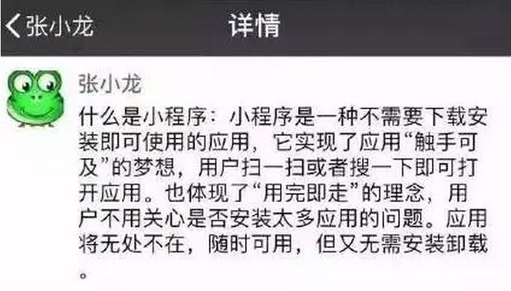 什么是微信小程序呢?根據張小龍的官方解釋,微信小程序,簡稱CX,是一種不需要下載安裝即可使用的應用,它實現了應用“觸手可及”的夢想,用戶掃一掃或搜一下即可打開應用。用最簡明扼要、通俗易懂的關鍵詞概括就是:又小又快的應用。體積小,不超過1M,打開快速,用完即走,來去自如,和進入一個網站頁面差不多的感覺。