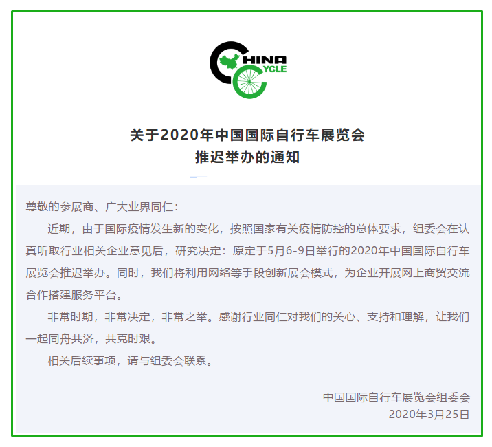 根據(jù)自行車(chē)展設(shè)計(jì)搭建公司領(lǐng)藝展覽了解到,原定于5月6-9日舉行的2020年中國(guó)國(guó)際自行車(chē)展覽會(huì)推遲舉辦。同時(shí),主辦方將利用網(wǎng)絡(luò)等手段創(chuàng)新展會(huì)模式,為企業(yè)開(kāi)展網(wǎng)上商貿(mào)交流合作搭建服務(wù)平臺(tái)。如需自行車(chē)展設(shè)計(jì)請(qǐng)聯(lián)系領(lǐng)藝展覽,希望我們能在自行車(chē)展搭建上為您添磚加瓦,祝各位朋友收獲多多,滿(mǎn)載而歸!