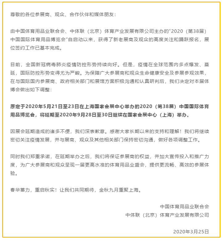 根據(jù)體博會設(shè)計(jì)搭建公司領(lǐng)藝展覽了解到,原定于2020年5月21日至23日在上海國家會展中心舉辦的2020(第38屆)中國國際體育用品博覽會,將延期至2020年9月28日至30日繼續(xù)在國家會展中心(上海)舉辦。如需體博會設(shè)計(jì)請聯(lián)系領(lǐng)藝展覽,希望我們能在體博會搭建上為您添磚加瓦,祝各位朋友收獲多多,滿載而歸!