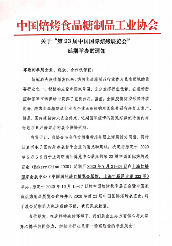 根據(jù)烘焙展設計搭建公司領藝展覽了解到,第23屆中國國際焙烤展覽會(原定于2020年5月6-9日于上海新國際博覽中心舉辦)將延期至2020年7月21-24日在上海虹橋國家會展中心(中國國際進口博覽會場館,上海市崧澤大道333號)舉辦。如需烘焙展設計請聯(lián)系領藝展覽,希望我們能在烘焙展搭建上為您添磚加瓦,祝各位朋友收獲多多,滿載而歸!