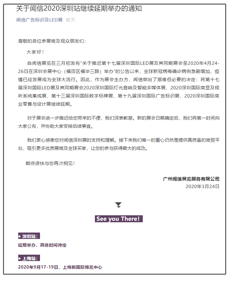據(jù)LED展設(shè)計搭建公司領(lǐng)藝展覽了解到,自聞信展覽在三月初發(fā)布“關(guān)于推遲第十七屆深圳國際LED展及其同期展會至2020年4月24-26日在深圳會展中心(福田區(qū)福華三路)舉辦”的公告以來,全球新冠病毒確診病例急劇增加,疫情已經(jīng)發(fā)展成為全球大流行。因此,作為展會主辦方,聞信做出了艱難但必要的決定:將第十七屆深圳國際LED展及其同期展會2020深圳國際燈光音響及智能多媒體展、2020深圳國際商顯及視聽系統(tǒng)集成展、第十三屆深圳國際數(shù)字標(biāo)牌展、第十九屆深圳國際廣告標(biāo)識展、2020深圳國際商業(yè)零售與設(shè)計展繼續(xù)延期。如需LED展設(shè)計請聯(lián)系領(lǐng)藝展覽,希望我們能在LED展搭建上為您添磚加瓦,祝各位朋友收獲多多,滿載而歸!