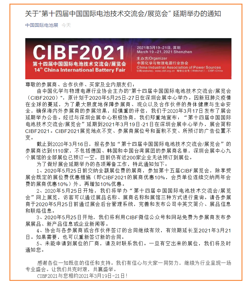 根據(jù)電池展設(shè)計(jì)搭建公司領(lǐng)藝展覽了解到,原計(jì)劃于2020年5月25日-27日在深圳會(huì)展中心舉辦。因新冠肺炎疫情在全球的蔓延,為了最大限度地保障參展商、觀眾以及合作伙伴的身體健康與生命安全,確保海內(nèi)外參展商的參展效果,經(jīng)慎重的評(píng)估,我們于2020年3月17日發(fā)布了展會(huì)延期舉辦公告。經(jīng)過與深圳會(huì)展中心積極協(xié)商,我們鄭重地宣布:“第十四屆中國國際電池技術(shù)交流會(huì)/展覽會(huì)”延期到2021年3月19日-21日在深圳會(huì)展中心舉辦,展會(huì)簡(jiǎn)稱CIBF2021。如需電池展設(shè)計(jì)請(qǐng)聯(lián)系領(lǐng)藝展覽,希望我們能在電池展搭建上為您添磚加瓦,祝各位朋友收獲多多,滿載而歸!