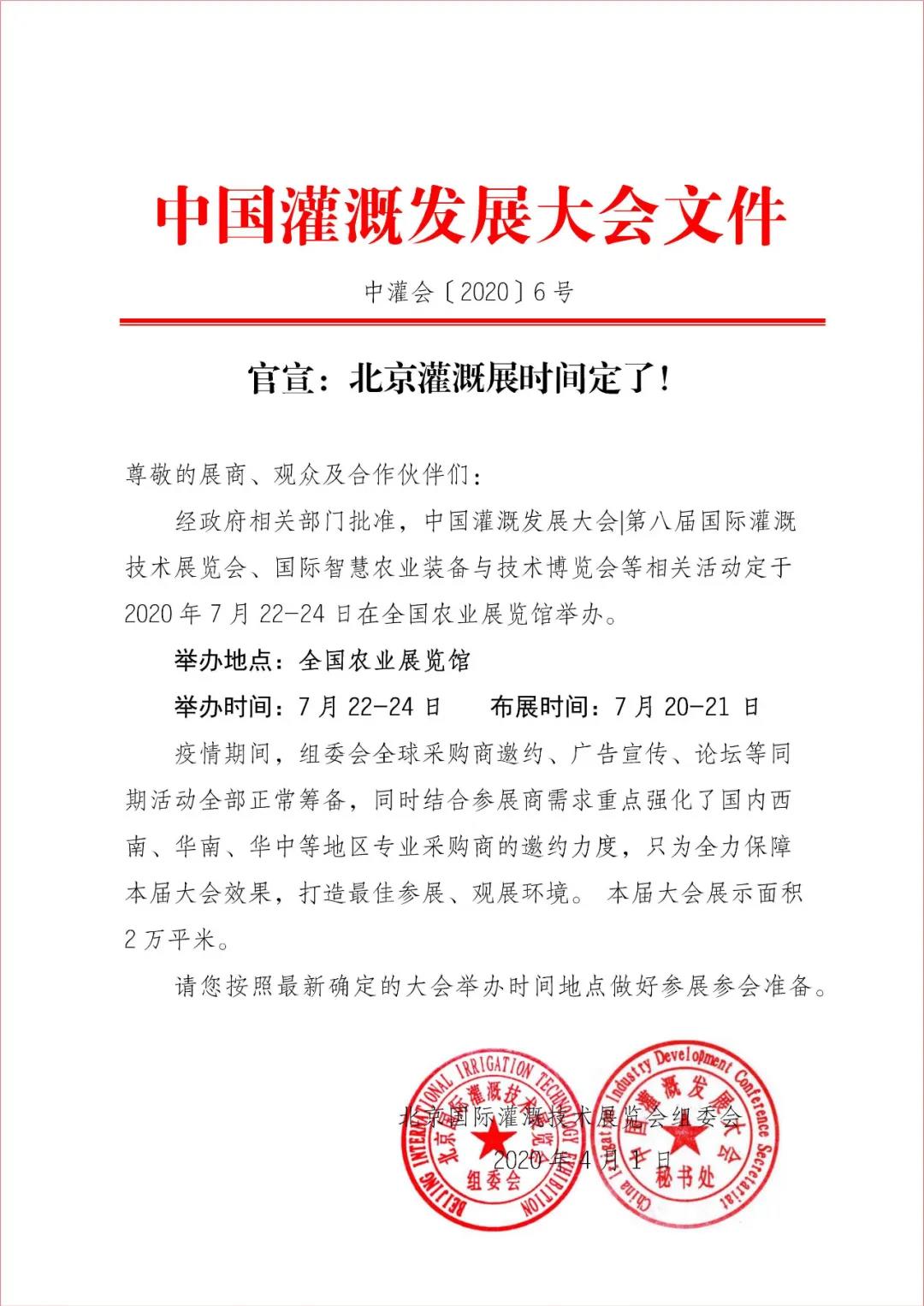 根據(jù)灌溉展設(shè)計搭建公司領(lǐng)藝展覽了解到,受新冠肺炎疫情影響,原定于2020年4月13-15日舉辦的中國灌溉發(fā)展大會|第八屆國際灌溉技術(shù)展覽會(ITE2020),將延期至7月22日至24日在北京·全國農(nóng)業(yè)展覽館(北京市朝陽區(qū)東三環(huán)北路16號)舉行。如需灌溉展設(shè)計請聯(lián)系領(lǐng)藝展覽,希望我們能在灌溉展搭建上為您添磚加瓦,祝各位朋友收獲多多,滿載而歸!