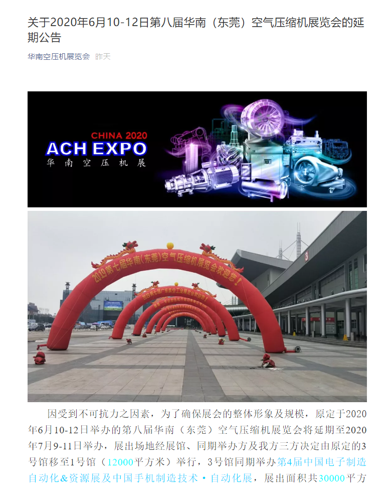 根據(jù)空壓機展設(shè)計搭建公司領(lǐng)藝展覽了解到,原定于2020年6月10-12日舉辦的第八屆華南(東莞)空氣壓縮機展覽會將延期至2020年7月9-11日舉辦,展出場地經(jīng)展館、同期舉辦方及我方三方?jīng)Q定由原定的3號館移至1號館(12000平方米)舉行,3號館同期舉辦第4屆中國電子制造自動化&資源展及中國手機制造技術(shù)·自動化展,展出面積共30000平方米,這將為此次展會帶來更專業(yè)、更有實效性的展出成果。如需空壓機展設(shè)計請聯(lián)系領(lǐng)藝展覽,希望我們能在空壓機展搭建上為您添磚加瓦,祝各位朋友收獲多多,滿載而歸!