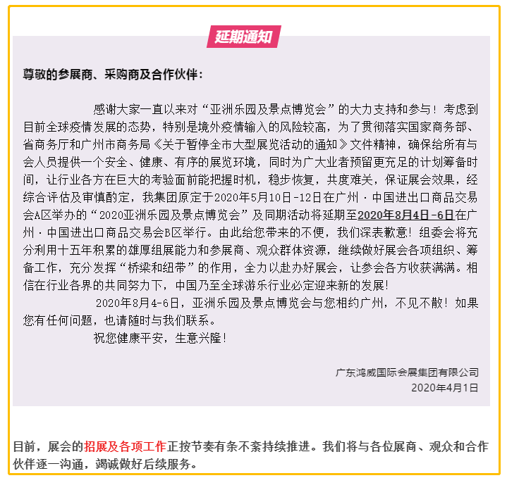 根據(jù)樂園展設(shè)計(jì)搭建公司領(lǐng)藝展覽了解到,受新冠肺炎疫情影響,原定于2020年5月10日-12日在廣州·中國進(jìn)出口商品交易會A區(qū)舉辦的“2020亞洲樂園及景點(diǎn)博覽會”及同期活動將延期至2020年8月4日-6日在廣州·中國進(jìn)出口商品交易會B區(qū)舉行。如需樂園展設(shè)計(jì)請聯(lián)系領(lǐng)藝展覽,希望我們能在樂園展搭建上為您添磚加瓦,祝各位朋友收獲多多,滿載而歸!