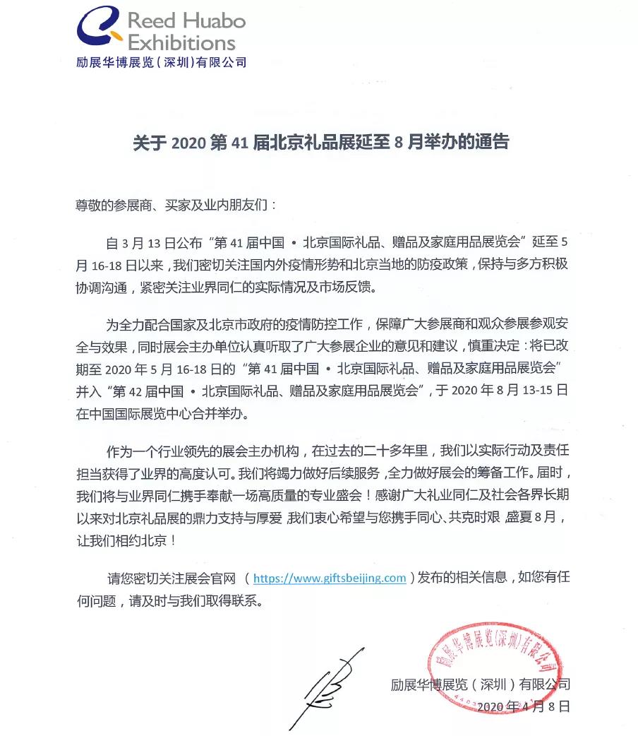 根據(jù)禮品展設(shè)計搭建公司領(lǐng)藝展覽了解到,為全力配合國家及北京市政府的疫情防控工作,保障廣大參展商和觀眾參展參觀安全與效果,同時展會主辦單位認(rèn)真聽取了廣大參展企業(yè)的意見和建議,慎重決定:將已改期至2020年5月16-18日的“第41屆中國?北京國際禮品、贈品及家庭用品展覽會”并入“第42屆中國?北京國際禮品、贈品及家庭用品展覽會”,于2020年8月13-15日在北京·中國國際展覽中心(靜安莊館)合并舉辦。如需禮品展設(shè)計請聯(lián)系領(lǐng)藝展覽,希望我們能在禮品展搭建上為您添磚加瓦,祝各位朋友收獲多多,滿載而歸!