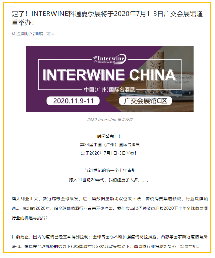 根據(jù)名酒展設(shè)計搭建公司領(lǐng)藝展覽了解到,INTERWINE科通夏季展將于2020年7月1-3日廣交會展館隆重舉辦!如需名酒展設(shè)計請聯(lián)系領(lǐng)藝展覽,希望我們能在名酒展搭建上為您添磚加瓦,祝各位朋友收獲多多,滿載而歸!