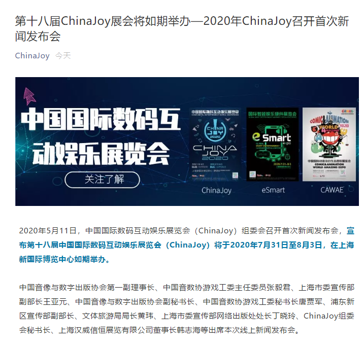 上海ChinaJoy游戲展設計搭建公司領藝展覽了解到,2020年5月11日,中國國際數(shù)碼互動娛樂展覽會(ChinaJoy)組委會召開首次新聞發(fā)布會,宣布第十八屆中國國際數(shù)碼互動娛樂展覽會(ChinaJoy)將于2020年7月31日至8月3日,在上海新國際博覽中心如期舉辦。如需展會設計請聯(lián)系領藝展覽,希望我們能在上海展會搭建上為您添磚加瓦,祝各位朋友收獲多多,滿載而歸!