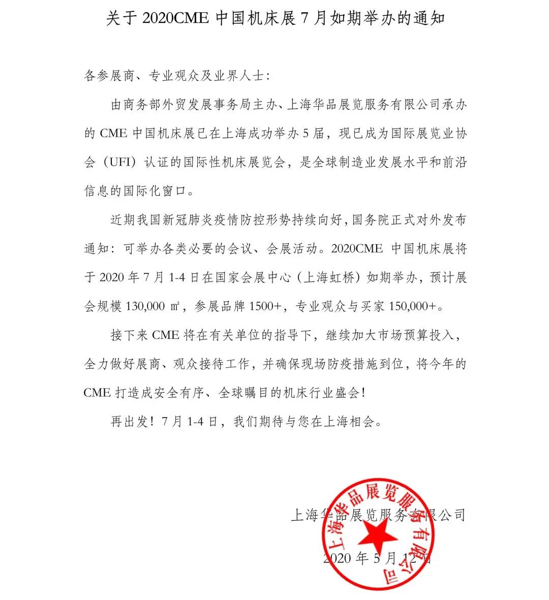 上海機床展設(shè)計搭建公司領(lǐng)藝展覽了解到,原定于2020年2月25日舉行的CME中國機床展將延期至2020年7月1-4日舉行。如需上海機床展設(shè)計請聯(lián)系領(lǐng)藝展覽,希望我們能在上海機床展搭建上為您添磚加瓦,祝各位朋友收獲多多,滿載而歸!