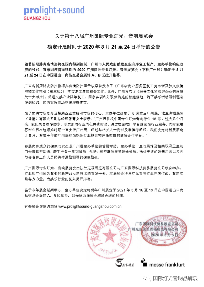 廣州燈光音響展設(shè)計搭建公司領(lǐng)藝展覽了解到,隨著新冠肺炎疫情形勢在國內(nèi)得到控制,廣州市人民政府鼓勵企業(yè)有序復(fù)工復(fù)產(chǎn)。主辦單位響應(yīng)政府的號召,宣布因疫情而延期的2020廣州國際專業(yè)燈光、音響展覽會(下稱廣州展)確定于8月21至24日在中國進出口商品交易會展館A、B區(qū)拉開帷幕。如需廣州燈光音響展設(shè)計請聯(lián)系領(lǐng)藝展覽,希望我們能在廣州燈光音響展搭建上為您添磚加瓦,祝各位朋友收獲多多,滿載而歸!