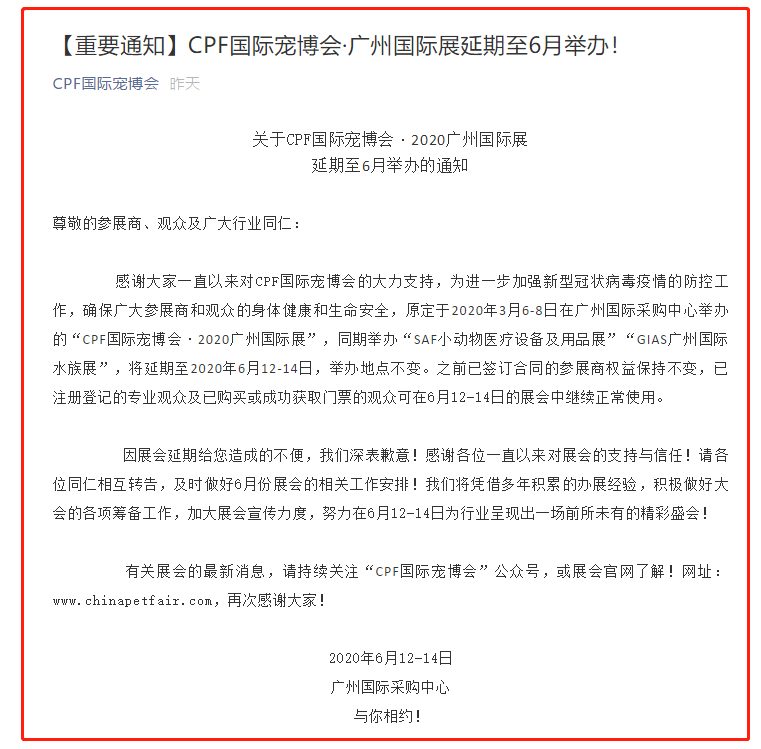 根據(jù)CPF寵博會設計搭建公司領(lǐng)藝展覽了解到,為進一步加強新型冠狀病毒疫情的防控工作,確保廣大參展商和觀眾的身體健康和生命安全,原定于2020年3月6-8日在廣州國際采購中心舉辦的“CPF國際寵博會·2020廣州國際展”,同期舉辦“SAF小動物醫(yī)療設備及用品展”“GIAS廣州國際水族展”,將延期至2020年6月12-14日,舉辦地點不變。如需廣州寵博會設計請聯(lián)系領(lǐng)藝展覽,希望我們能在寵物展搭建上為您添磚加瓦,祝各位朋友收獲多多,滿載而歸!