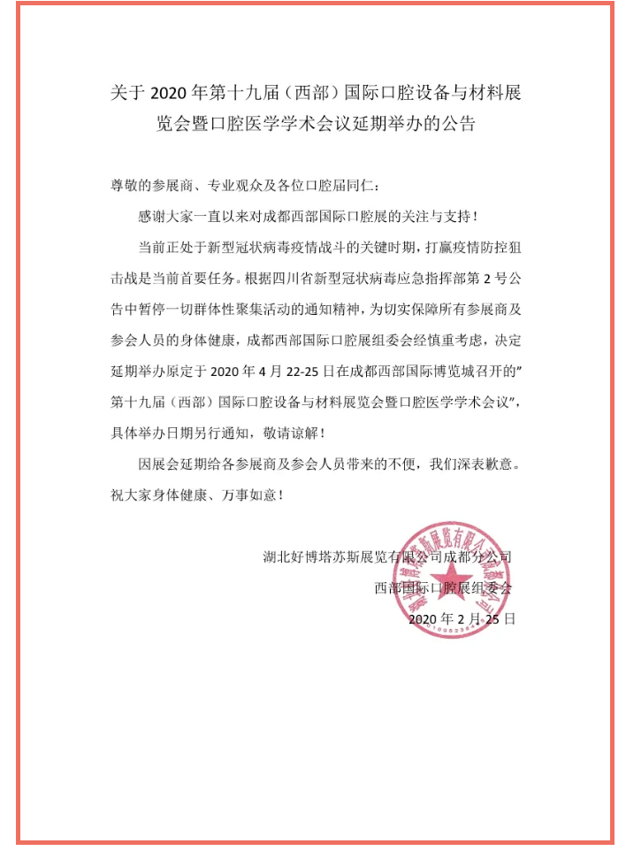 根據(jù)成都西部國際口腔展設(shè)計(jì)搭建公司領(lǐng)藝展覽了解到,當(dāng)前正處于新型冠狀病毒疫情戰(zhàn)斗的關(guān)鍵時(shí)期,打贏疫情防控狙擊戰(zhàn)是當(dāng)前首要任務(wù)。根據(jù)四川省新型冠狀病毒應(yīng)急指揮部第2號公告中暫停一切群體性聚集活動的通知精神,為保障所有參展商及參會人員的安全和健康,成都西部國際口腔展組委會經(jīng)慎重考慮,決定延期舉辦原定于2020年4月22-25日在成都西部國際博覽城召開的“第十九屆(西部)國際口腔設(shè)備與材料展覽會暨口腔醫(yī)學(xué)學(xué)術(shù)會議”,具體舉辦日期另行通知,敬請諒解!如需成都口腔展設(shè)計(jì)請聯(lián)系領(lǐng)藝展覽,希望我們能在口腔展搭建上為您添磚加瓦,祝各位朋友收獲多多,滿載而歸!