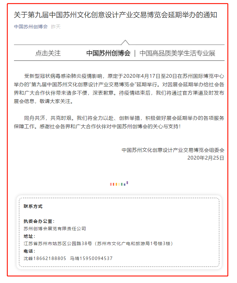 根據(jù)蘇州創(chuàng)博會設計搭建公司領藝展覽了解到,受新型冠狀病毒感染肺炎疫情影響,原定于2020年4月17日至20日在蘇州國際博覽中心舉辦的“第九屆中國蘇州文化創(chuàng)意設計產(chǎn)業(yè)交易博覽會”延期舉行。如需創(chuàng)博會設計請聯(lián)系領藝展覽,希望我們能在蘇州創(chuàng)博會搭建上為您添磚加瓦,祝各位朋友收獲多多,滿載而歸!