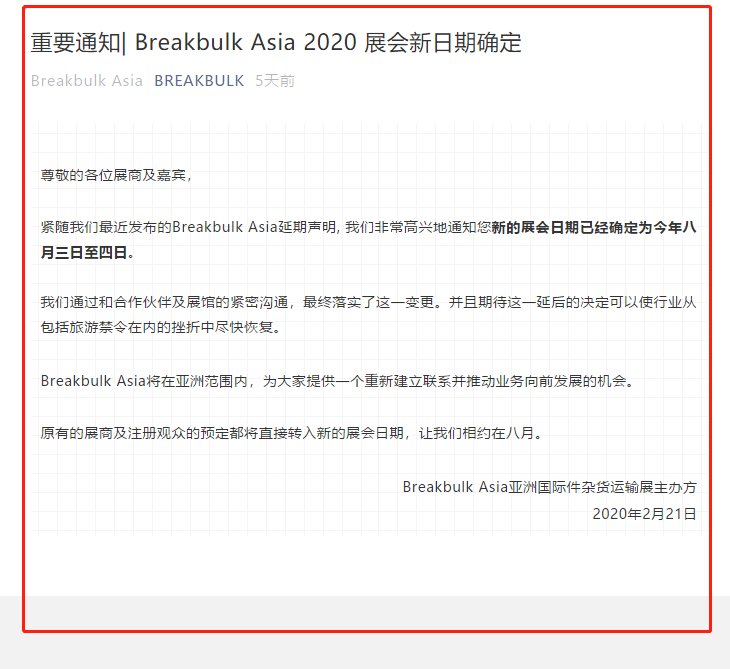 根據(jù)亞洲國際件雜貨運輸展設計搭建公司領藝展覽了解到,緊隨著主辦最近發(fā)布的Breakbulk Asia延期聲明, 我們非常高興地通知原定于2020年3月18日至19日在上海世博展覽館舉辦的Breakbulk Asia亞洲國際件雜貨運輸展覽會新的展會日期已經(jīng)確定為今年八月三日至四日。如需物流展設計請聯(lián)系領藝展覽,希望我們能在物流展搭建上為您添磚加瓦,祝各位朋友收獲多多,滿載而歸!