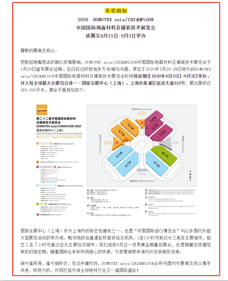 根據(jù)地材展設計搭建公司領藝展覽了解到,受新冠病毒感染的肺炎疫情影響,DOMOTEX asia/CHINAFLOOR中國國際地面材料及鋪裝技術展覽會于1月29日宣布展會延期。近日經(jīng)過積極地多方協(xié)調(diào)與溝通,原定于2020年3月24-26日舉辦的DOMOTEX asia/CHINAFLOOR中國國際地面材料及鋪裝技術展覽會時間將延期至2020年8月31日-9月2日舉辦,并入駐全球最大會展綜合體——國家會展中心(上海),上海市青浦區(qū)崧澤大道333號。如需地材展設計請聯(lián)系領藝展覽,希望我們能在地材展搭建上為您添磚加瓦,祝各位朋友收獲多多,滿載而歸!