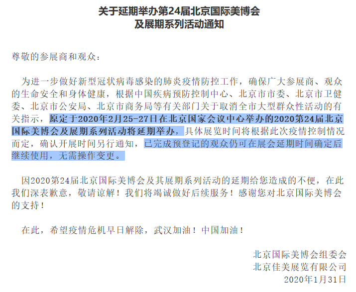 為進(jìn)一步做好新型冠狀病毒感染的肺炎疫情防控工作,確保廣大參展商、觀眾的生命安全和身體健康,根據(jù)中國疾病預(yù)防控制中心、北京市市委、北京市衛(wèi)健委、北京市公安局、北京市商務(wù)局等有關(guān)部門關(guān)于取消全市大型群眾性活動(dòng)的有關(guān)指示,原定于2020年2月25-27日在北京國家會(huì)議中心舉辦的2020第24屆北京國際美博會(huì)及展期系列活動(dòng)將延期舉辦,具體展覽時(shí)間將根據(jù)此次疫情控制情況而定,確認(rèn)開展時(shí)間另行通知,已完成預(yù)登記的觀眾仍可在展會(huì)延期時(shí)間確定后繼續(xù)使用,無需操作變更。如需北京美博會(huì)設(shè)計(jì)請(qǐng)聯(lián)系領(lǐng)藝展覽,希望我們能在北京美博會(huì)搭建上為您添磚加瓦,祝各位朋友收獲多多,滿載而歸!