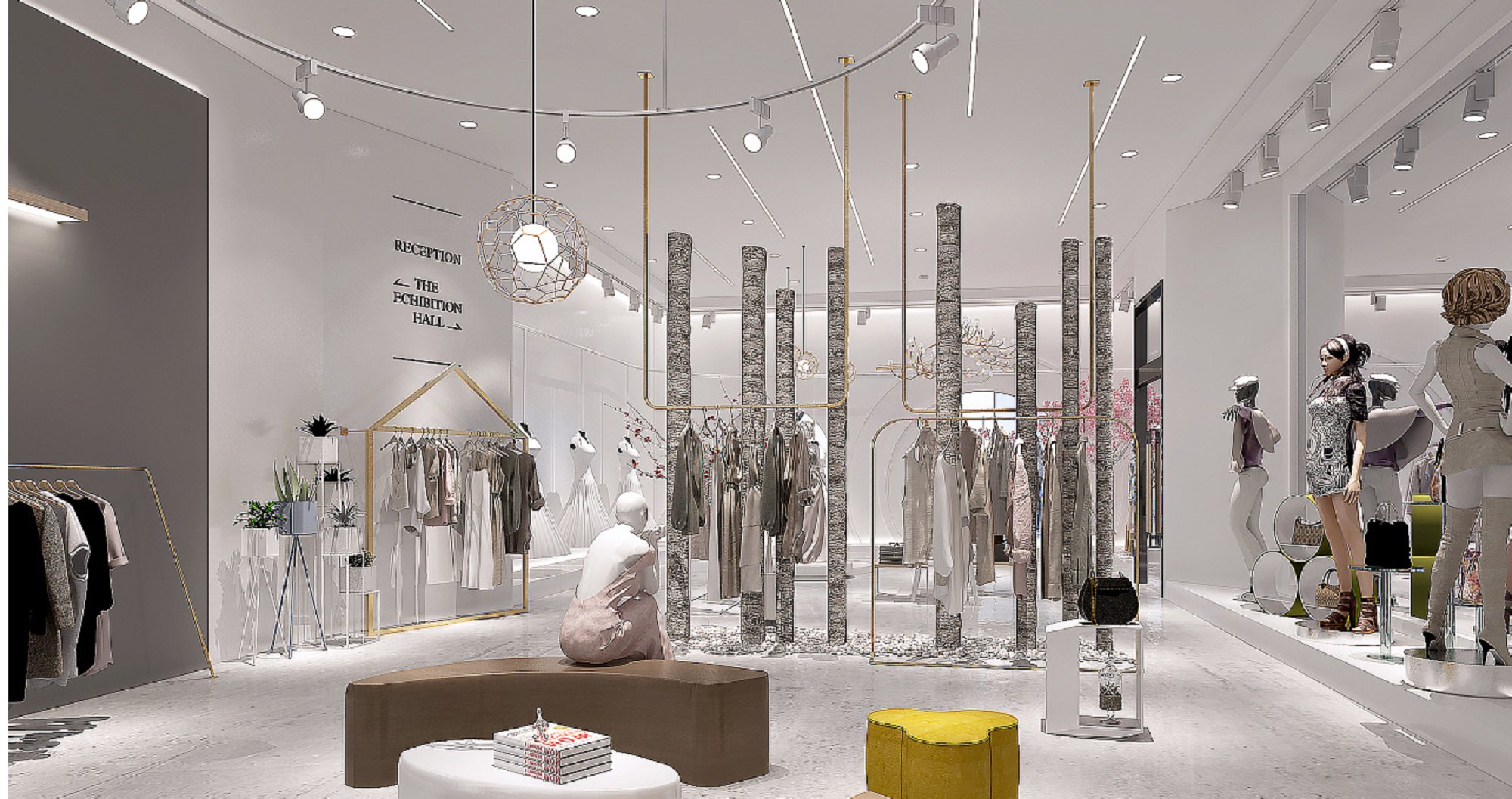 契合EIsissil服裝的品牌形象和產(chǎn)品特性,采用開(kāi)放式結(jié)構(gòu)進(jìn)行合理的分區(qū),再搭配燈具燈光的效果,襯托出展廳大氣、豪華的氛圍,突出一種簡(jiǎn)約、時(shí)尚的品味。